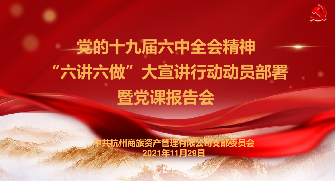 為(wèi)深入學習貫徹黨的十九屆六中全會(huì)精神,根據市商旅集團關于組織開(kāi)展“六講六做(zuò)”大(dà)宣講行(xíng)動總體(tǐ)部署,11月29日下午,商旅資管黨支部召開(kāi)學習貫徹黨的十九屆六中全會(huì)精神和(hé)組織開(kāi)展“六講六做(zuò)”大(dà)宣講行(xíng)動動員部署會(huì),支部書(shū)記餘勁輝結合十九屆六中全會(huì)精神作(zuò)專題黨課報告。公司全體(tǐ)黨員幹部參加。